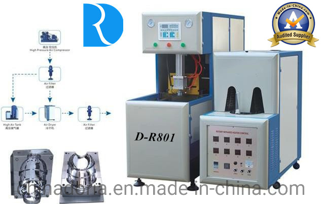 La macchina dello stampaggio mediante soffiatura di stirata D-R801 è Adatta da produrre le figure differenti delle bottiglie/vasi di PET/PP così Come i globi di PMMA (formato del collo inferiore a 100mm). È Applicabile per le bottiglie di salto da 5L a 10L ed è Ampiamente usato produrre l'acqua minerale, le bottiglie gassose ecc. Della bevanda, della spremuta, della medicina, dell'estetica e di olio